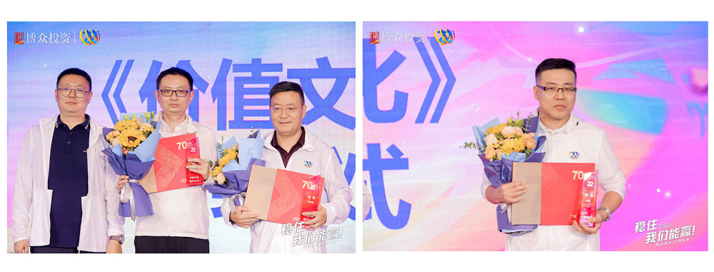 頒發(fā)博眾文化價值獎——個人獎。榮獲本屆“專注獎”的是來自博眾的劉冰老師、陳宗寶老師以及林杰老師。榮獲本屆“創(chuàng)新”獎的是陳細(xì)幫、張銘亮兩位博眾創(chuàng)新先鋒。最后一個獎項是“以客戶為中心”獎,獲得該項殊榮的,是來自博眾的孫文勝老師與劉開斌老師。均由廣東電視臺經(jīng)濟(jì)科教頻道副總經(jīng)理侯金龍先生為以上獲獎老師進(jìn)行頒獎并合影留念。